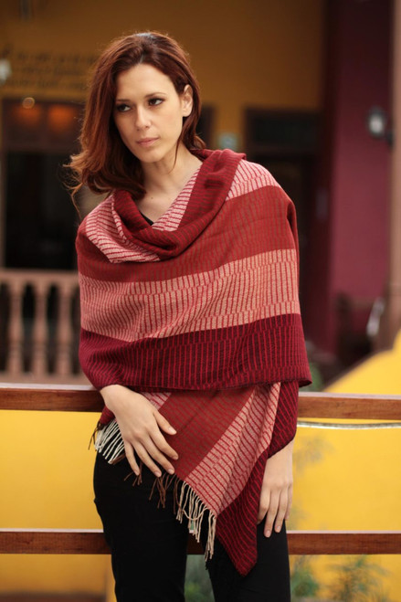 Wilmer Vilchez selects a vibrant palette of colors for the design of this shawl. Including red, brown, beige, and black, Vilchez works in warm baby alpaca wool (season's first shear) to create a beautiful shawl on a traditional handloom.