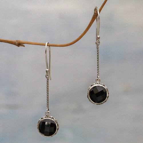 Faceted hemispheres of black onyx evoke the many faces of the night. Working in sterling silver, Buana showcases the sleek gems in modern earrings.
